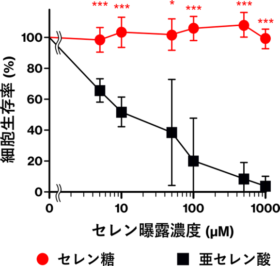 図2:ヒト肝がん細胞におけるセレン糖の細胞毒性試験 亜セレン酸でほぼすべての細胞が死滅する高濃度の条件であっても、セレン糖はまったく毒性を示さず、安全なセレン化合物であることが示された。