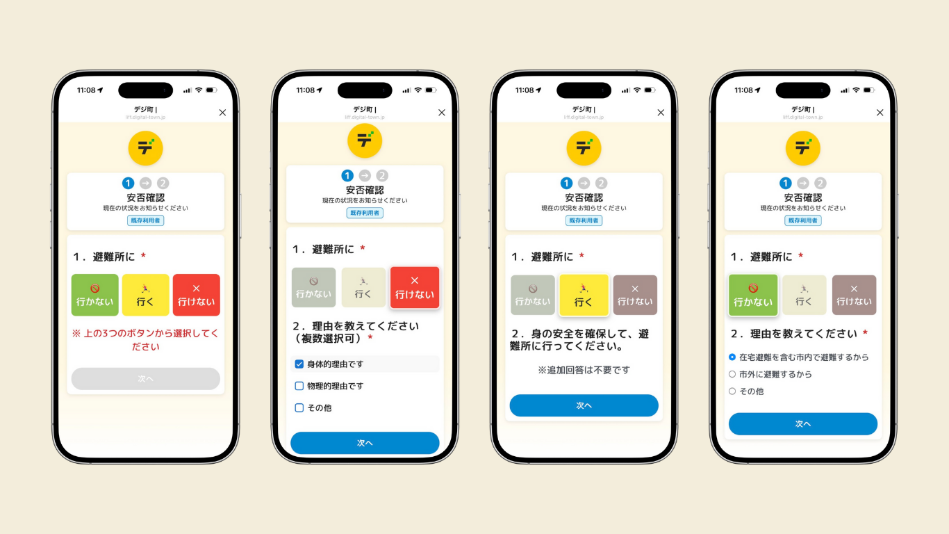 住民がスマートフォン(LINE)から安否状況を回答。避難行動の有無や理由を簡単な操作で送信可能