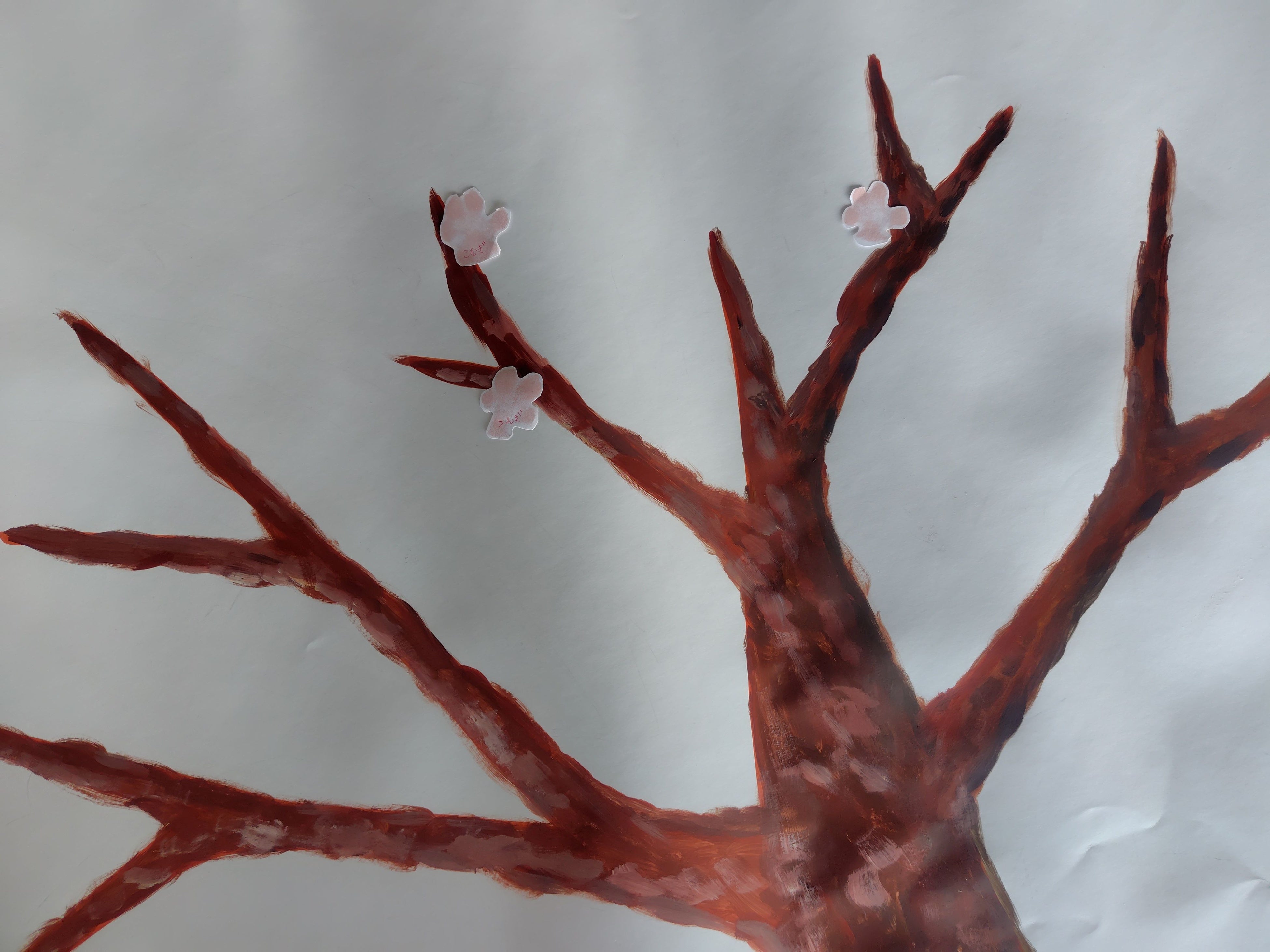 ・ワンちゃんの足型を使い、みんなでひとつの大きな桜アートを描く体験です。カフェスペースに用意する桜の幹を描いた縦80cm×横100cmほどの台紙に、ワンちゃん足型スタンプで桜の花を咲かせていきます。また、お部屋には桜ポストカードをご用意し、旅の思い出としてワンちゃんの足型を押して持ち帰ることもできます。