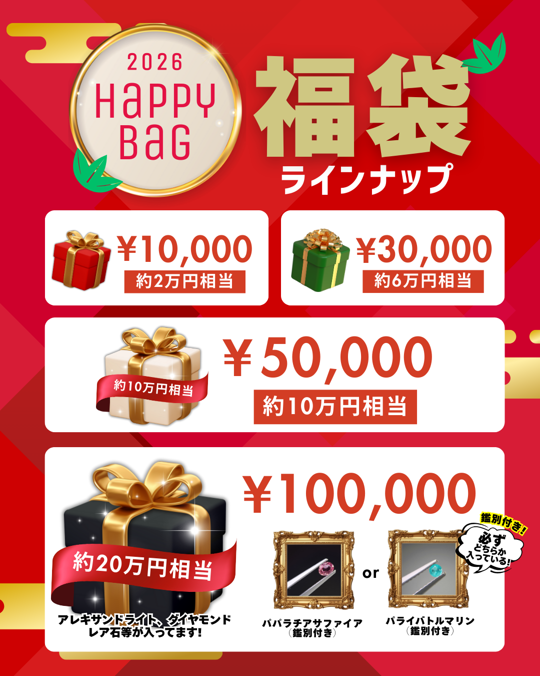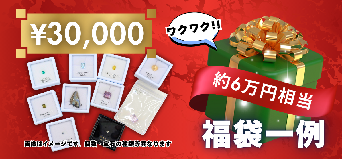 今年は、希少石入りの特別仕様や、最大で“購入金額の2倍相当”のルースが購入できるお得感が魅力の福袋になっています。