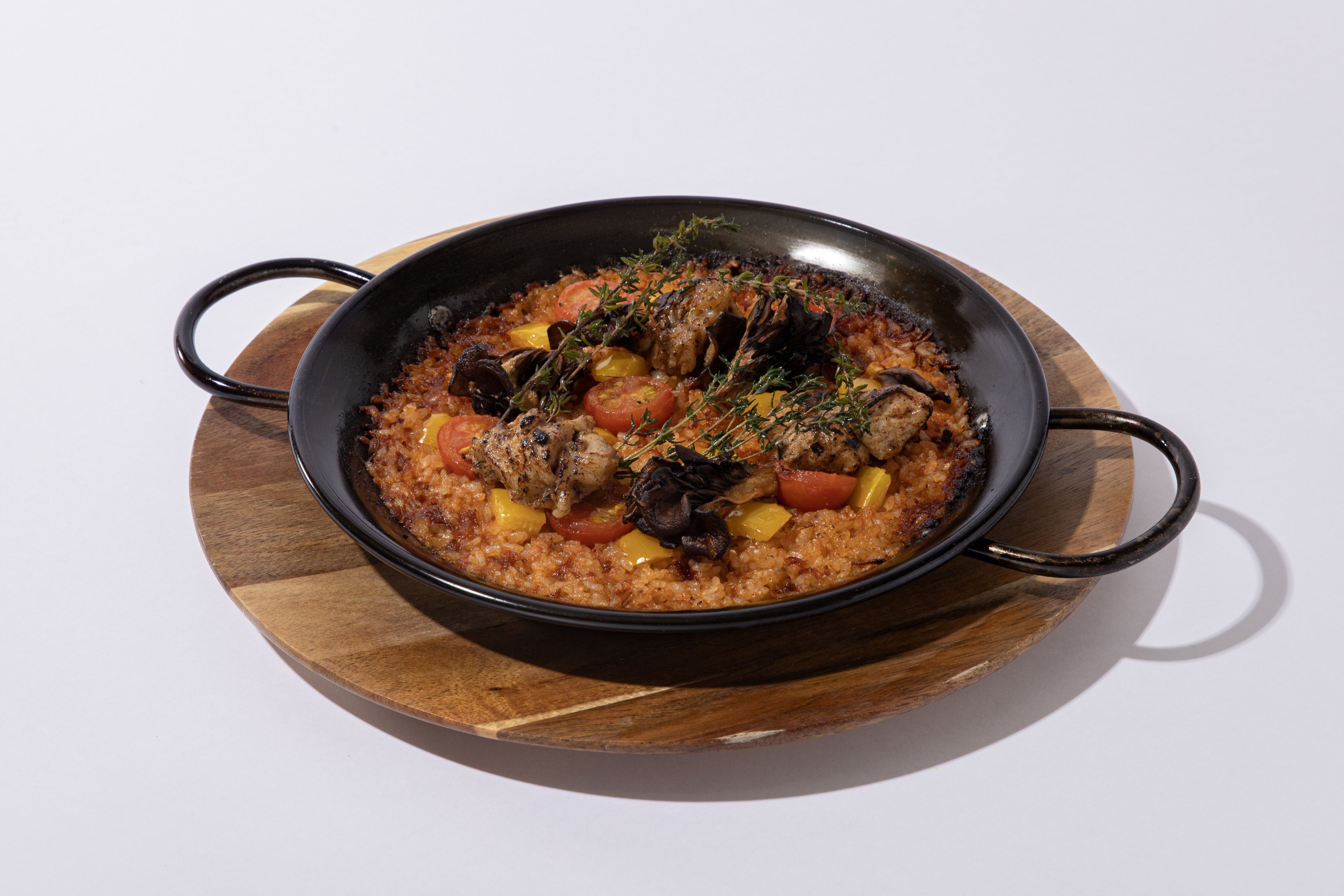 トマト、パプリカと共に焼き上げたパエリアに、ローストしたチキン、舞茸をトッピング!