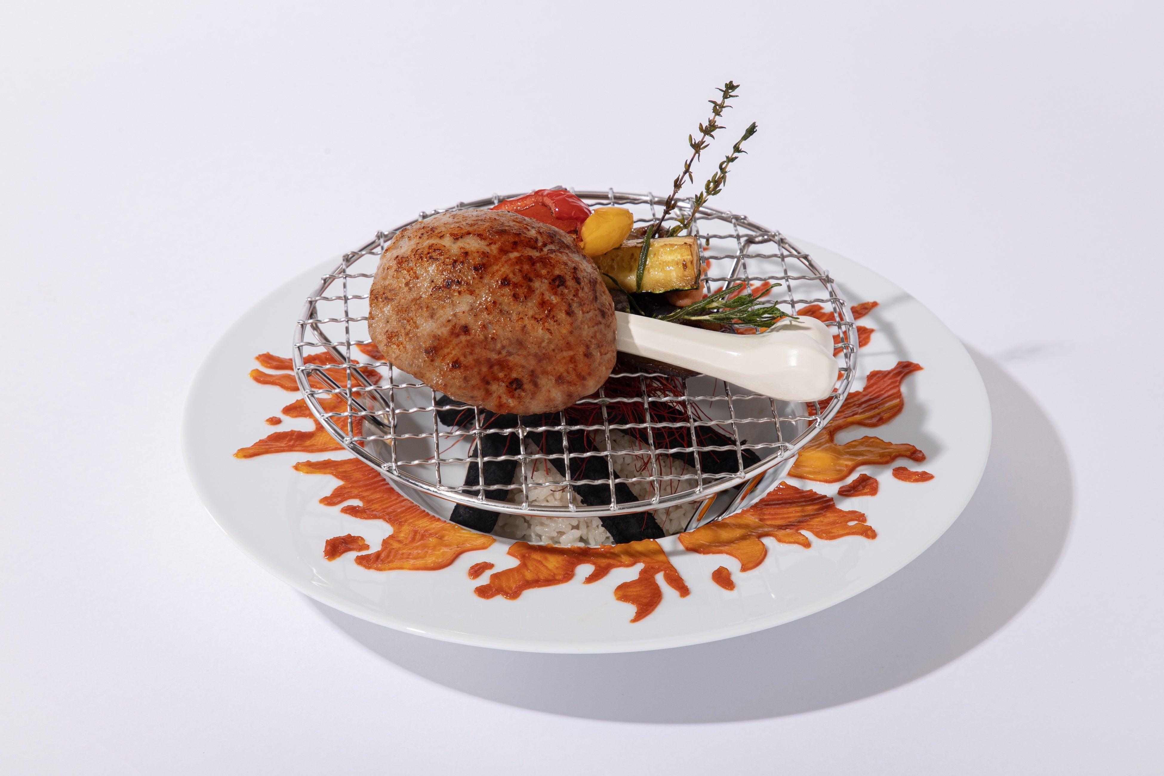 モンスターハンターおなじみの食べ物といえば、焚火で焼く骨付きのこんがり肉! 炭を思わせる黒いごぼうとほうじ茶ごはんの上に、骨付き風ハンバーグを大胆に盛り付け、炎を描いたプレートで世界観を表現しました。