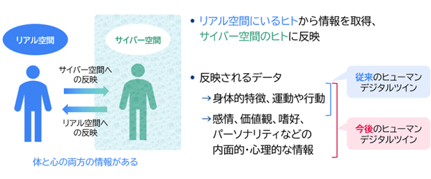 「デジタルツイン」は、リアル空間に存在する対象物から情報を取得し、サイバー空間上の対象物のモデルに反映する技術です。これまで、工場や都市といった物理的なモノをサイバー空間で再現する「モノのデジタルツイン」の活用が中心でしたが、センサーやAIといった情報処理技術の発展とともに、人を再現する「ヒューマン・デジタルツイン」の活用に注目が集まり始めています。