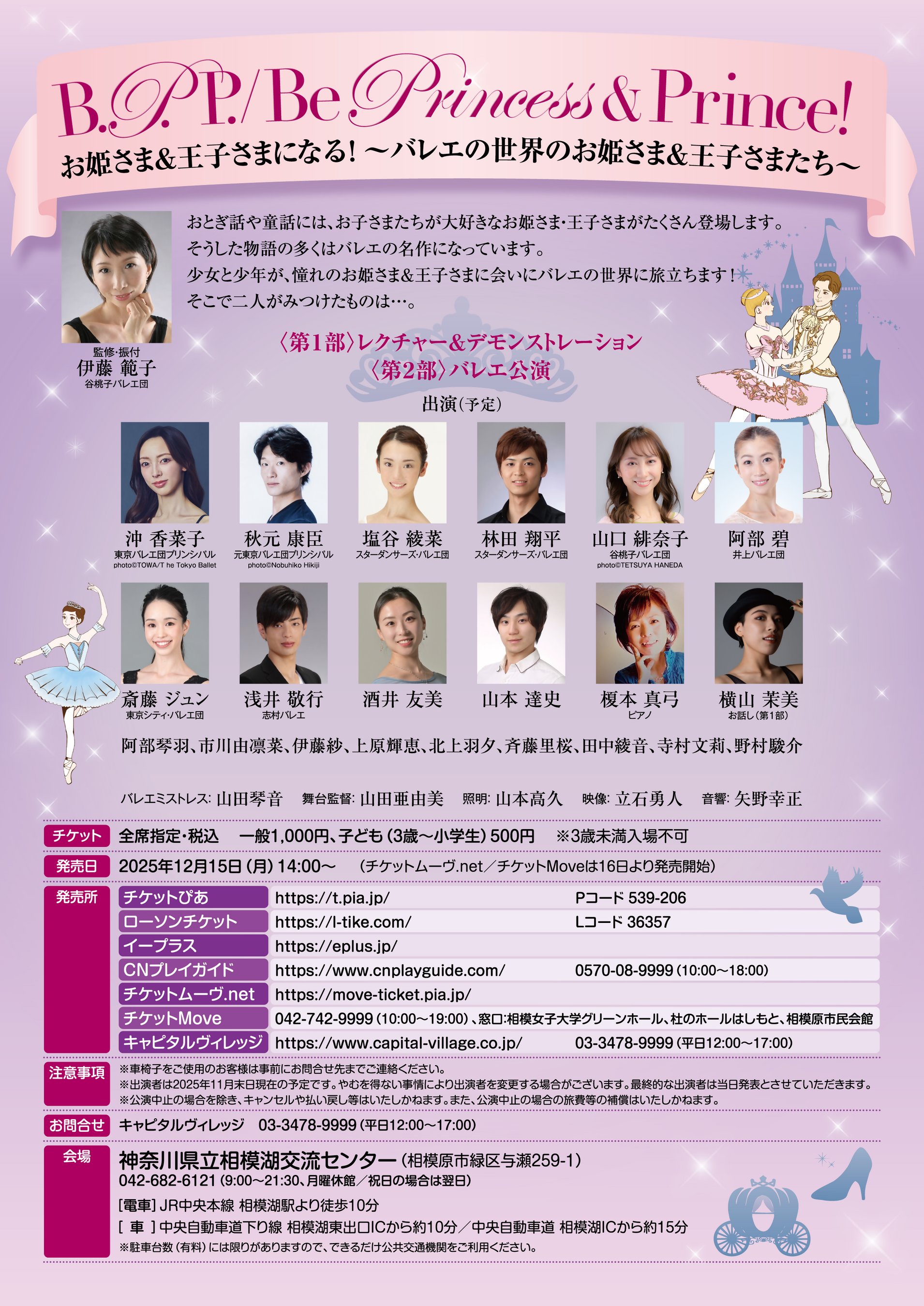 水源地域である相模湖地域の活性化を推進するため、地域が主体的に取り組む「芸術・文化のまちづくり」の機運醸成に向けて、県立相模湖交流センターにて、お子様をはじめとして、バレエに馴染みのない方々にもお楽しみいただけるよう、お姫さま・王子さまをテーマとしたバレエ公演を実施します。