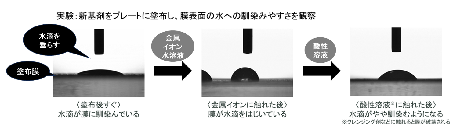 本技術は、汗や海水に含まれる金属イオンと反応する石鹸由来の成分を利用し、肌表面の塗布膜に特殊な構造を形成させることで撥水性と密着性を向上させます。ウォーターベースの日焼け止めは、軽い使用感で肌に馴染みやすくベタつきが少ないのが特徴ですが、汗や水に触れると落ちやすいため、これまでは耐水性を高めるために紫外線散乱剤や被膜剤が必要でした。今回はそれらを使用せず、水より軽く、柔軟でヨレにくい膜を形成することが可能になり、高い耐水性と紫外線防御力を持続しつつ、白浮きや黒い服への白移りが少ない透明な仕上がりを実現しました。