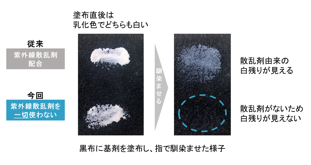 なお、今回使用した石鹸成分は、洗い流さない製品に最適化したものであり、肌に石鹸成分が残ることによる懸念はありません。また、紫外線散乱剤を配合しないことで洗浄性も向上し、しっとりとした洗い上がりの感触になります。