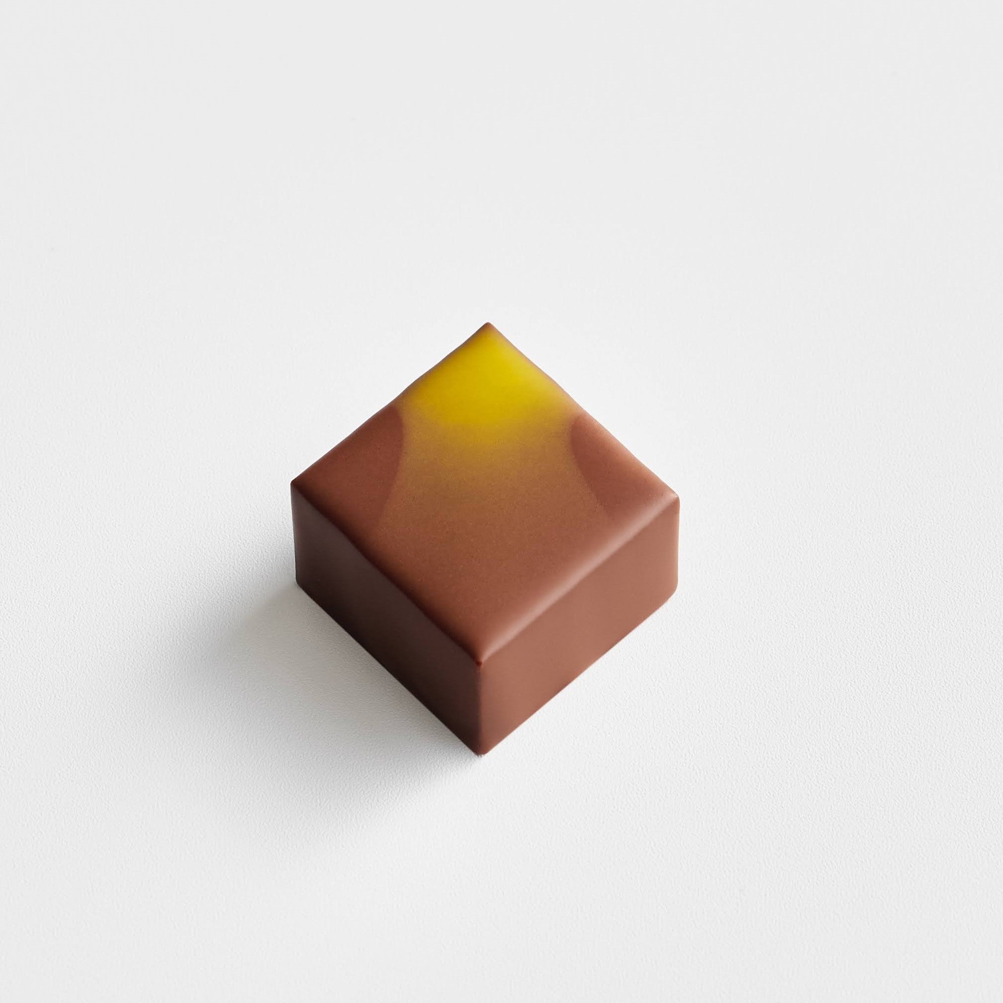 愛媛県産ゆずピールと石川県産ゆず果汁を合わせたパートドフリュイをショコラオレで包みました。ゆずならではのキレのある酸味と香りを、まろやかな甘みのショコラオレが引き立てます。