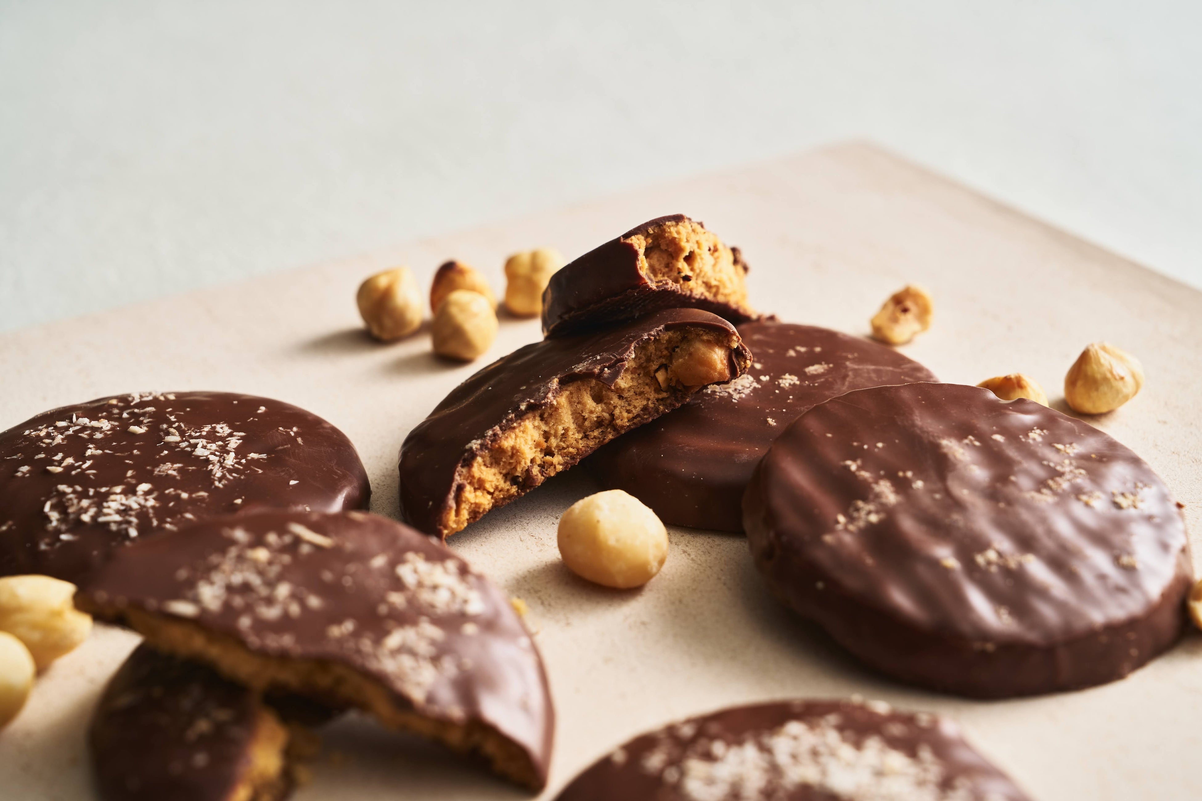 ローストしたヘーゼルナッツを使用して作ったプラリネと、大きめに刻んだヘーゼルナッツ、チョコチップを生地に練り込み、焼き上げたサブレに、ショコラオレをコーティング。
