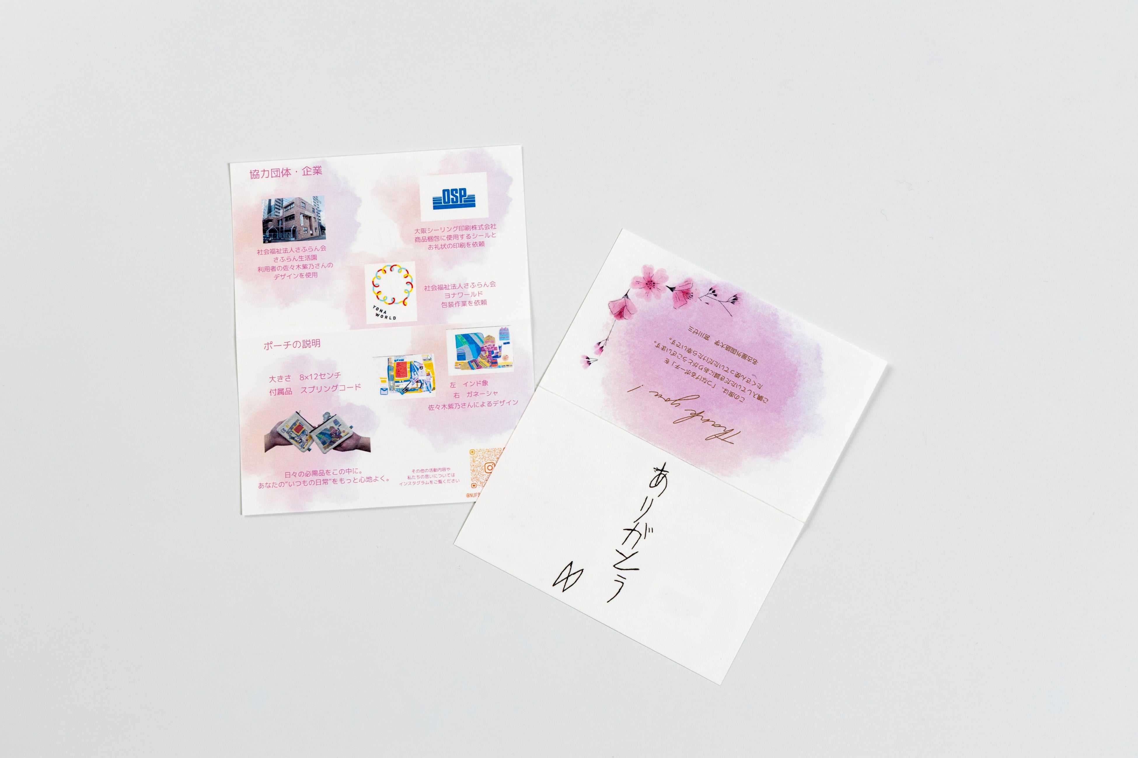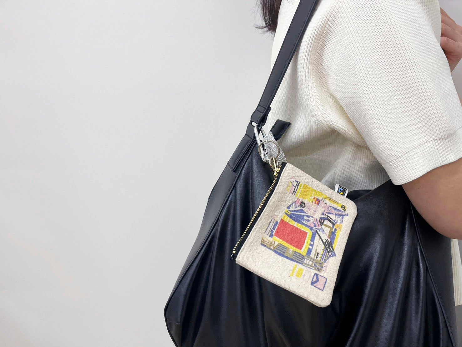 2年前は商品化に至らず悔しい気持ちがあったので、今回は必ず商品化させるという気持ちで参加し、「多くの方に使っていただける商品」をテーマに開始しました。ポーチ、サコッシュ、巾着袋の3候補が挙がった後は難航し、以前から交流があった大阪シーリング印刷さんに相談したところ、福祉施設をご紹介いただきました。施設の方より「障がいのある方は障がい者手帳を携帯されている」と聞き、手帳入れになるポーチに決めました。定期や小物入れにも使用できるサイズで、鞄の中で探さなくて済むようにカラナビを付けて利便性も考慮しました。