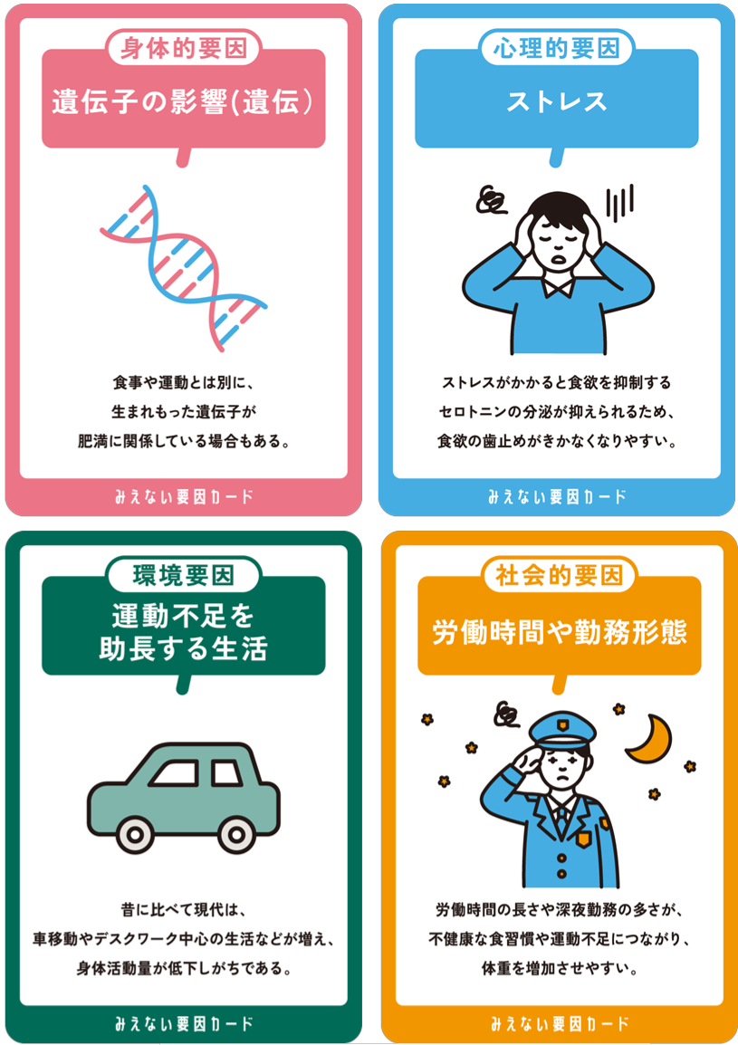 すごろくを進めながら、「みえない要因カード」を4種類(身体的要因、心理的要因、環境要因、社会的要因)揃えてゴールを目指すボードゲームです。カードを集めながら、肥満や肥満症には自分だけでは解決できない複合的な要因があることを理解できる仕組みになっています。