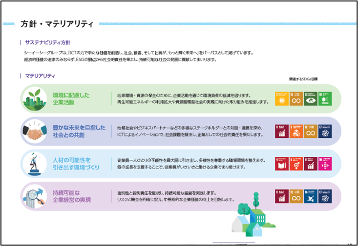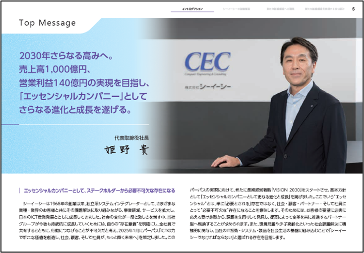本報告書では、2025年3月に策定した長期経営計画「VISION 2030」と「中期経営計画 2025-2027」を紹介するとともに、シーイーシーが目指す「エッセンシャルカンパニー」の実現に向け、パーパスを起点に資本と事業活動の関係を示す「価値創造プロセス」を提示し、持続可能な経営に不可欠な「マテリアリティとその特定プロセス」なども掲載しています。