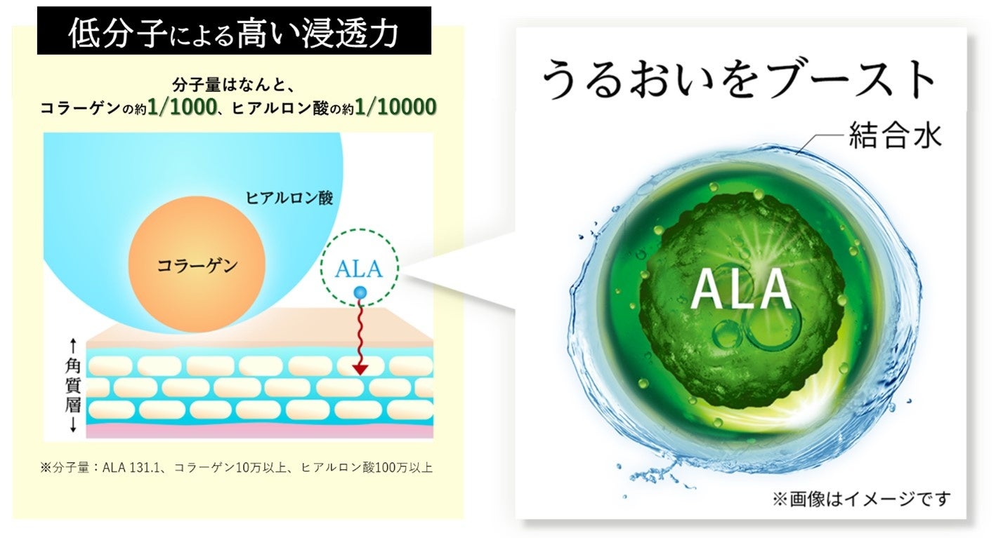 ALA(※1)とは、生命の根源物質と言われる天然アミノ酸で、肌細胞内のミトコンドリアに元々存在し、うるおいやハリを支える美容成分。ヒアルロン酸の約1/10000という極めて小さい分子量ゆえの高い浸透力、さらに、水を引き寄せ、水を連れて浸透する(※7)性質を持ち、うるおいを土台からブーストし、肌本来の美しさを呼び覚まします。