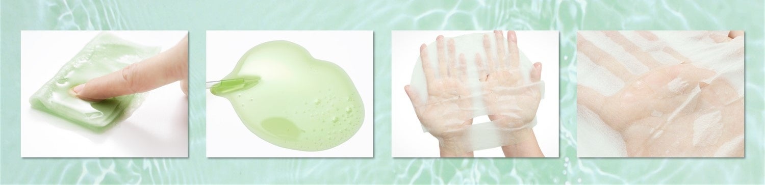 美容液は植物の葉緑素(クロロフィル)由来のGREENカラー!1袋に美容液2.5本分(※8)の75mLを贅沢に使用し、たっぷりのひたひた感でうるおいが持続します。また、肌あたりなめらかで軽く薄いシートは肌にピッタリと密着し、はがれにくいので、ながら美容にも最適です。