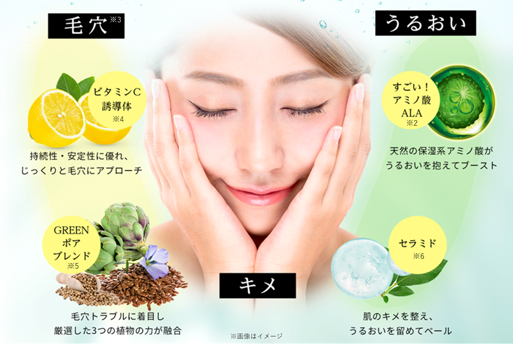 毛穴(※3)ケアの定番成分「ビタミンC誘導体(※4)」、3つの植物を融合した毛穴(※3)ケア成分「GREENポアブレンド(※5)」、独自のうるおいブースター「ALA(※2)」、うるおいをベールしキメを整える「セラミド(※6)」を贅沢に配合しました。。