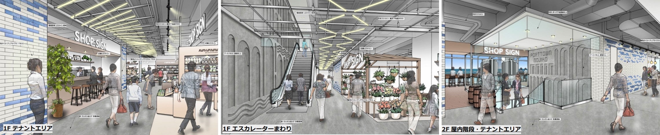 - 商業施設エリアのコンセプトは「門司港の新定番」です。全9テナントの入居を予定しており、現在6テナントが確定しています。開業時には全テナントが同時に開業する予定です。- 1階(4店舗):カフェを併設した福岡発のセレクト雑貨店をはじめ、スタイリッシュな空間で門司港観光グッズを販売し北九州の魅力を発信するショップ、食物販、カフェなど、地域の特色を活かした店舗が揃います。- 2階(5店舗):北九州で人気の焼きカレー、ラーメン、海鮮レストランなどの飲食店が出店予定です。2階のテラスからは関門海峡を一望でき、季節や時間の移ろいを体感できる特別な空間をご提供します。