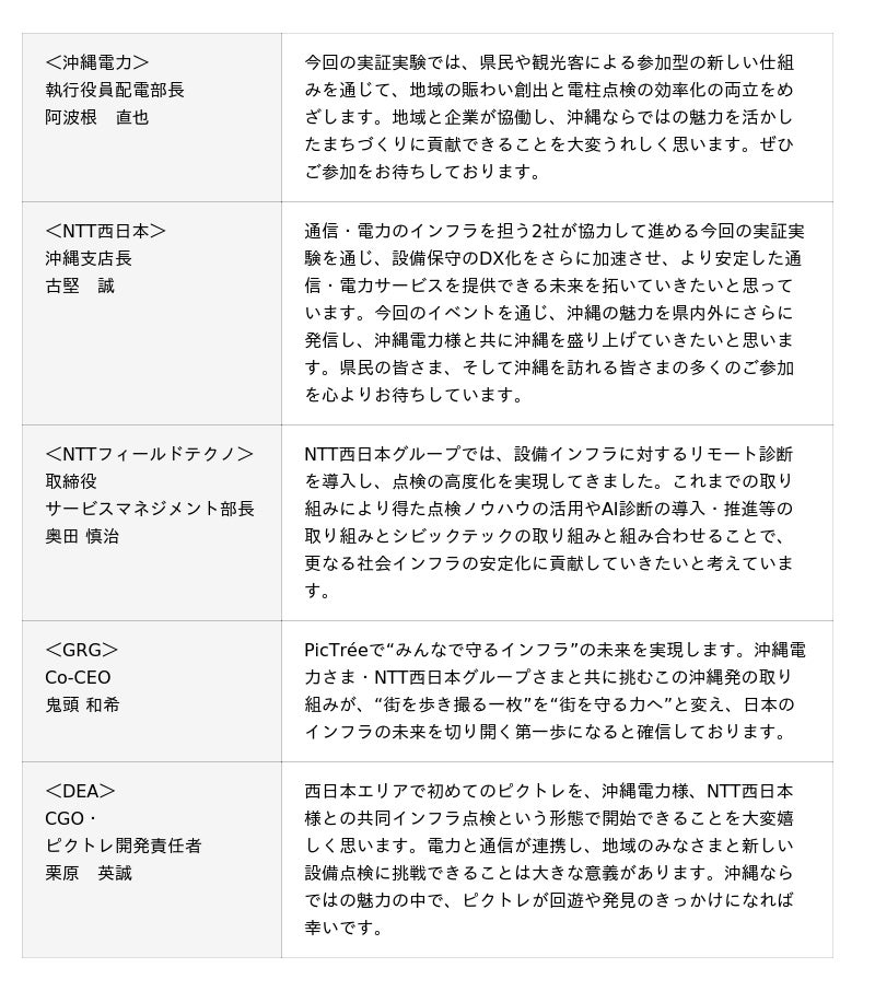 NTT西日本株式会社 (本社:大阪府大阪市、代表取締役社長:北村 亮太、以下「NTT西日本」)、株式会社NTTフィールドテクノ(本社:大阪府大阪市、代表取締役社長:桂 一詞、以下「NTTフィールドテクノ」)、沖縄電力株式会社(本社:沖縄県浦添市、代表取締役社長:本永 浩之、以下「沖縄電力」)は、Digital Entertainment Asset Pte. Ltd.(本社:シンガポール、Founder & CEO:吉田 直人、Founder & Co-CEO:山田 耕三、以下「DEA」)が開発し、Growth Ring Grid Pte. Ltd.(本社:シンガポール、CEO:福田 史、Co-CEO:鬼頭 和希、以下「GRG」)が運営する市民参加型社会貢献ゲーム「PicTree(ピクトレ)」※1を活用した市民参加イベント「ぼくとわたしの電柱合戦in沖縄」を2026年2月1日(日)から3月22日(日)の約2ヶ月間開催し、共同点検※2に向けた実証実験を行います。
