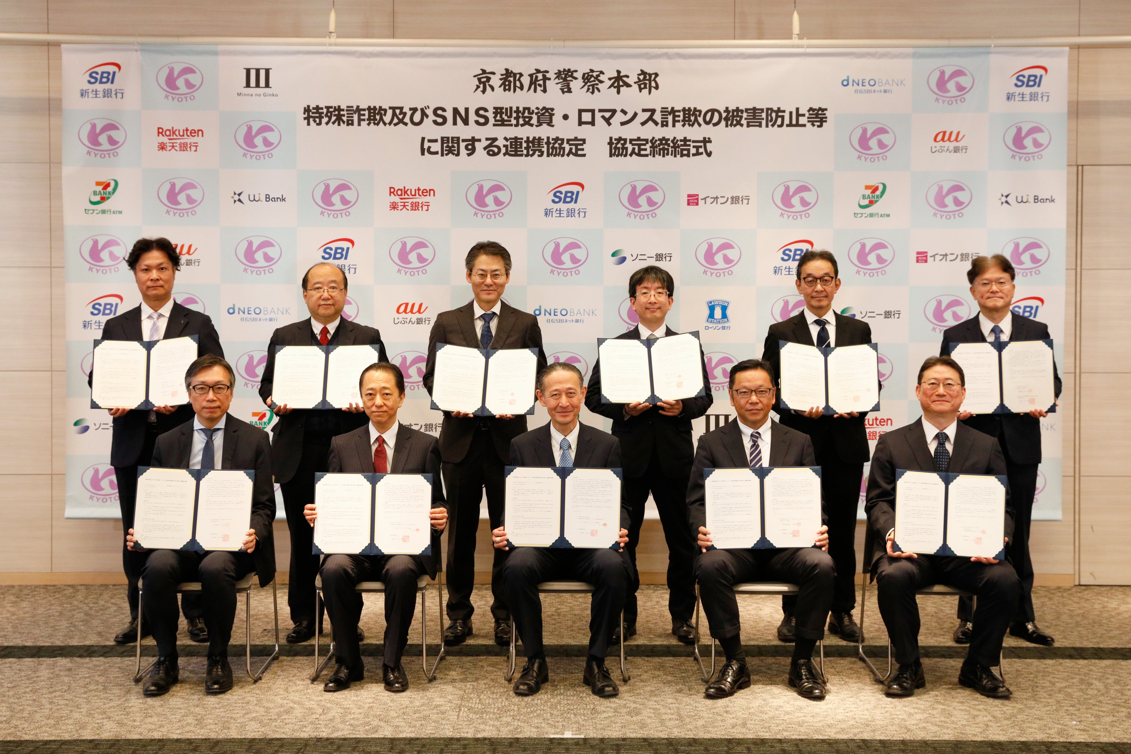 株式会社SBI新生銀行(本社:東京都中央区、代表取締役社長:川島 克哉、以下「当行」)は、他の金融機関9行(以下、当行と合わせて「協定行」)とともに、深刻化する特殊詐欺やSNS型投資詐欺・ロマンス詐欺の被害拡大防止を目的に、京都府警察が運用する「京都モデル」の開始に向けて、同府警察との間で「特殊詐欺及びSNS型投資・ロマンス詐欺等の対策に関する協定書」を締結いたしました。