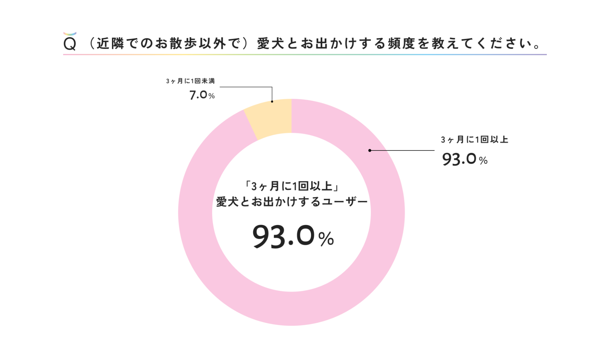 さらに、Wan!Passユーザーのお出かけ意欲は極めて高く、「(お散歩以外で)愛犬とお出かけする頻度」について、93%のユーザーが「3ヶ月に1回以上」と回答しており、愛犬と共にあるライフスタイルを大切にしていることがわかります。