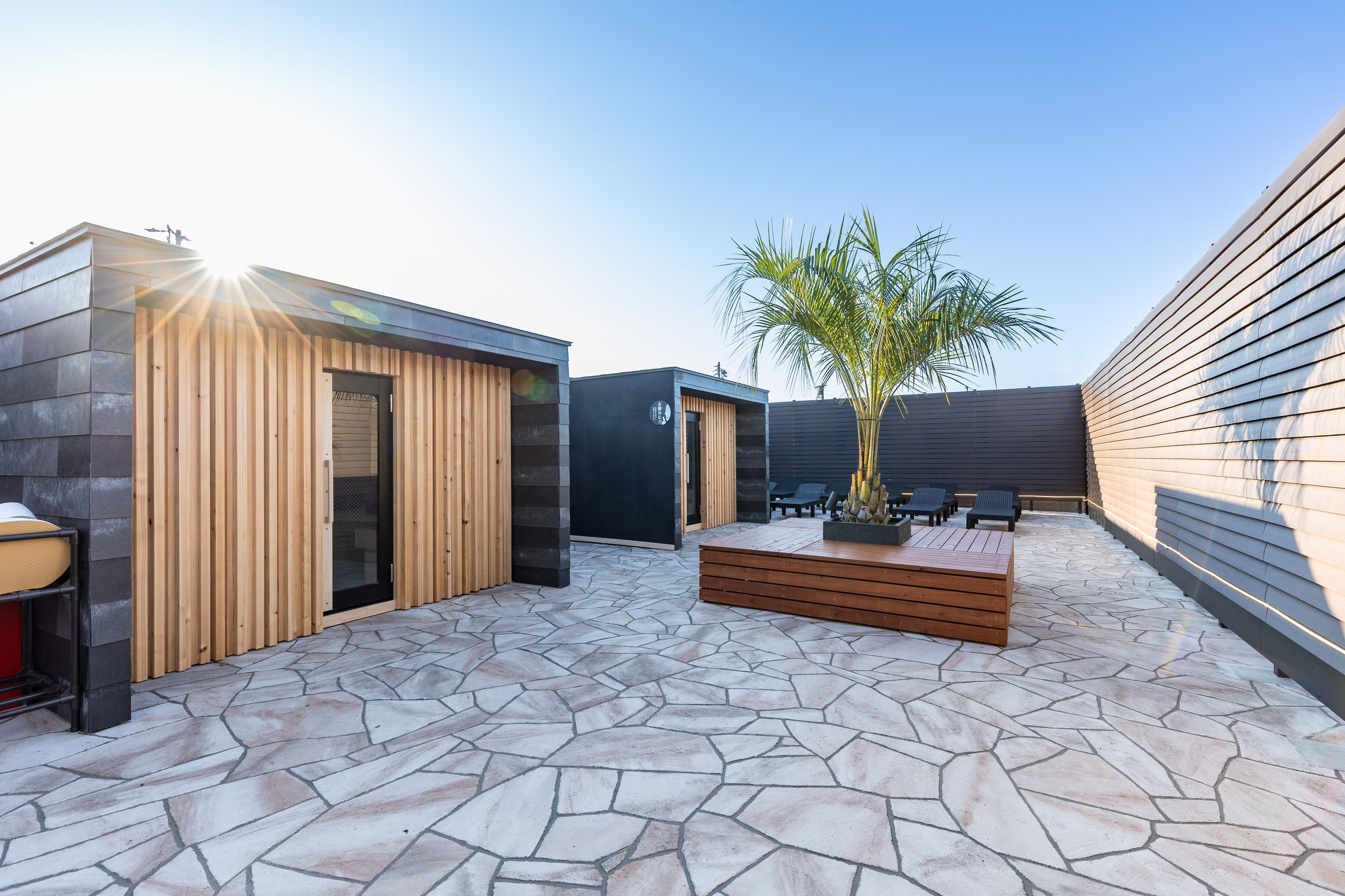 屋外には、一度に最大8名までご利用いただけるサウナを2棟設置しております。サウナを出た後に、外気欲が楽しめるととのいスペースもご用意しており、屋内とは異なる開放感をご堪能いただけます。