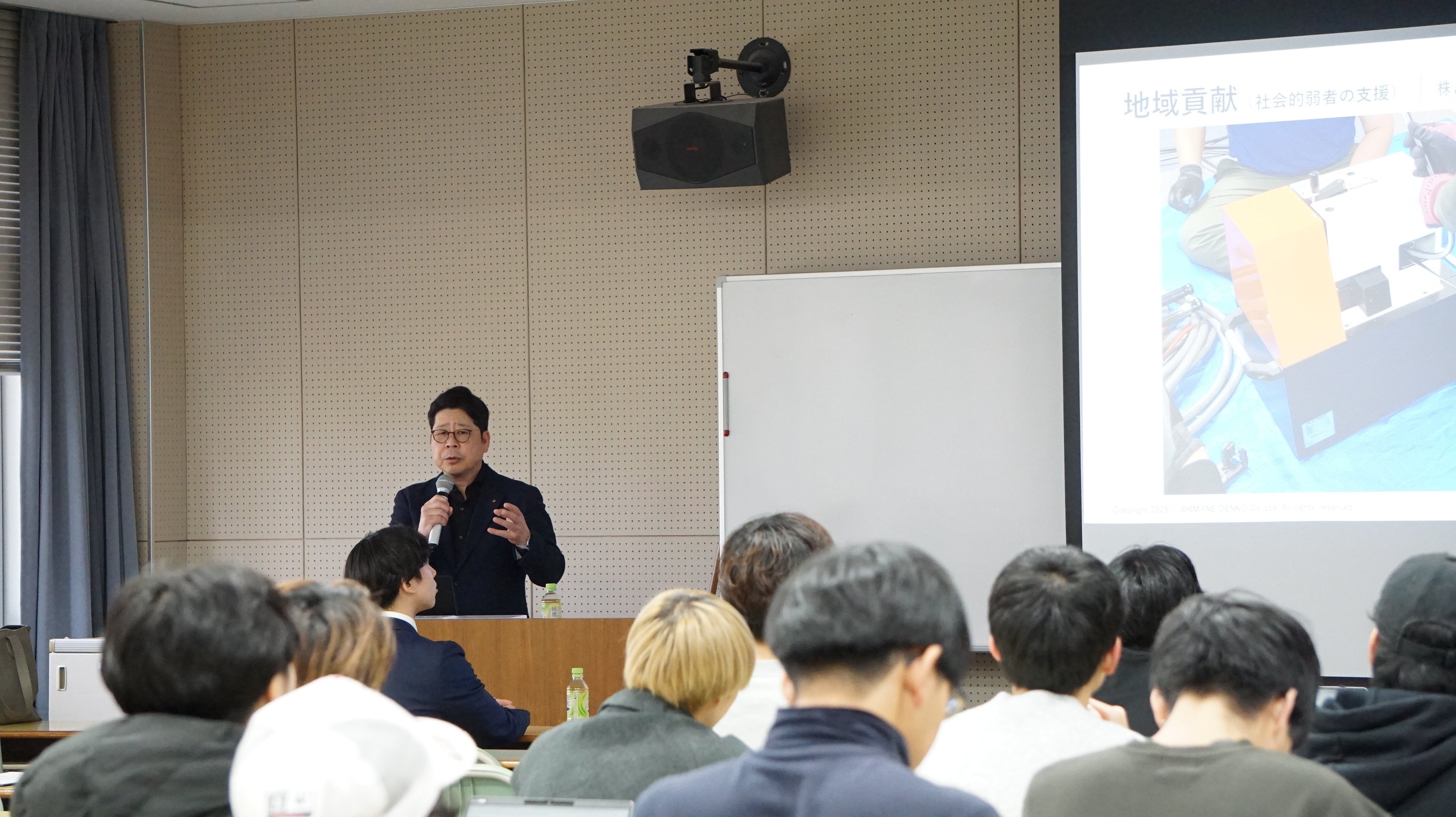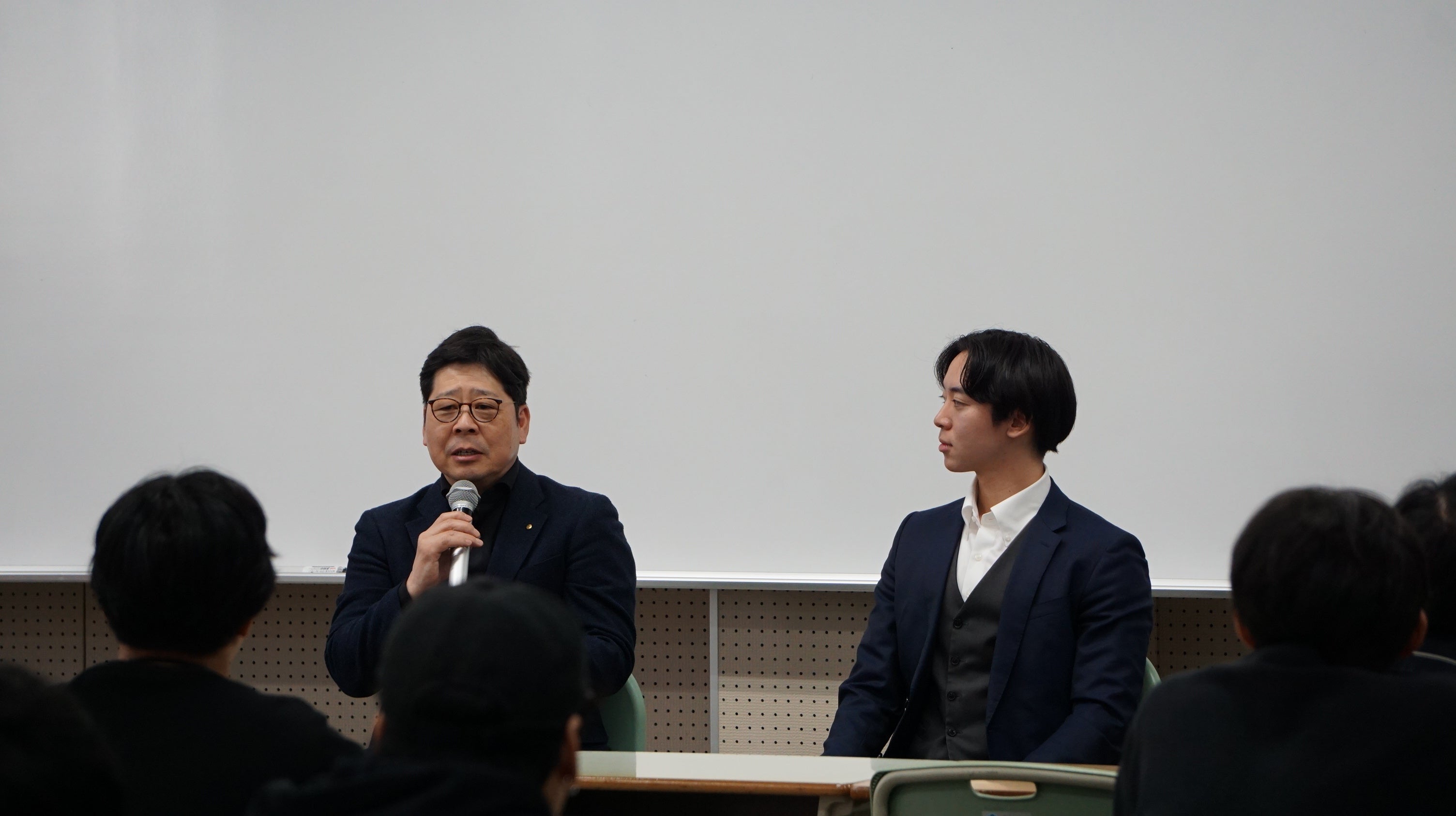 当社代表の野津と、現役島根大生でありながらAI開発企業を経営する中尾氏が登壇しました。 中尾氏は「環境を言い訳にせず、あえて厳しい道を選ぶことが成長への近道」と、学生起業家ならではの視点で熱弁。対して野津は「失敗を恐れずに挑戦できる環境を作るのが我々の役目。島根には人を大切にし、挑戦を応援する島根電工という企業があることを知ってほしい」と応じました。 立場や世代は違えど、「挑戦するマインド」で共鳴する二人の姿に、学生たちが真剣に聞き入る様子が見られました。