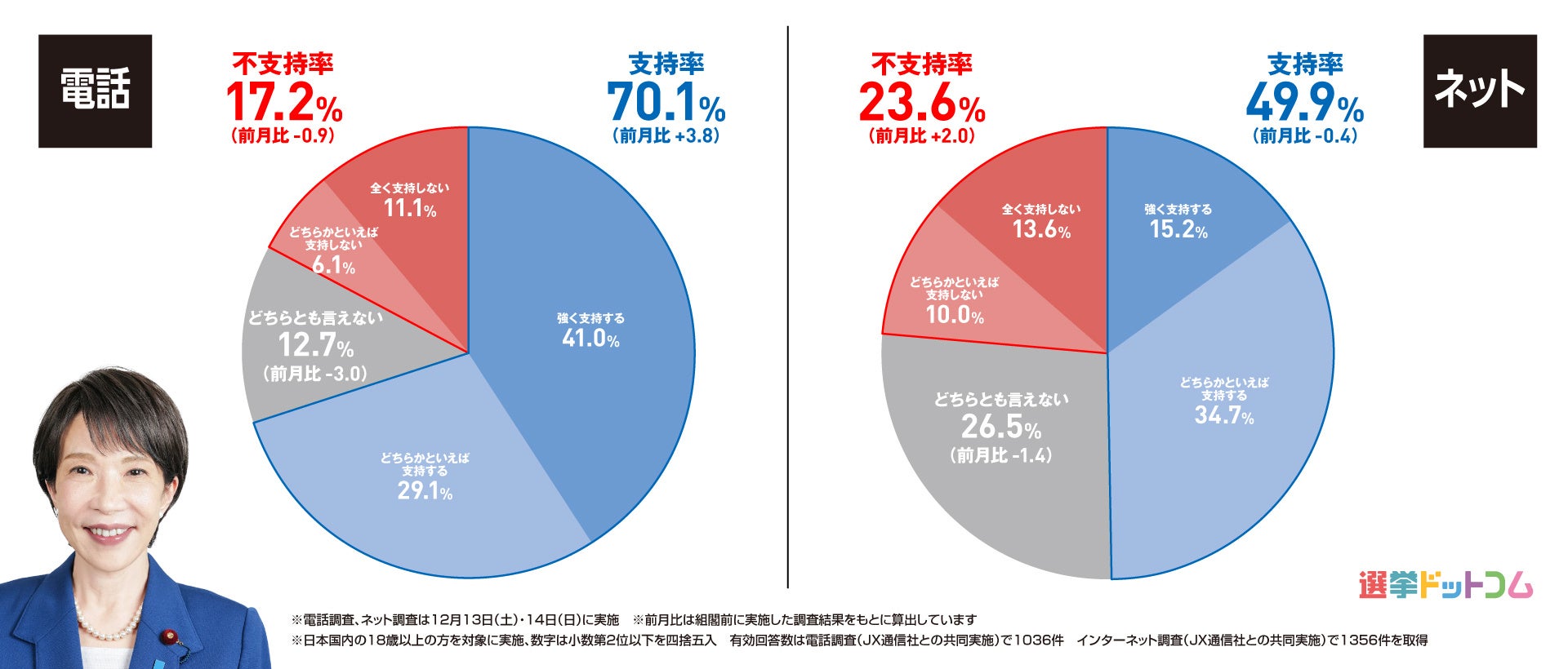 高市内閣支持率7割に上昇!比例投票先で与党が伸びる一方、野党勢力は?2025年12月電話×ネット意識調査