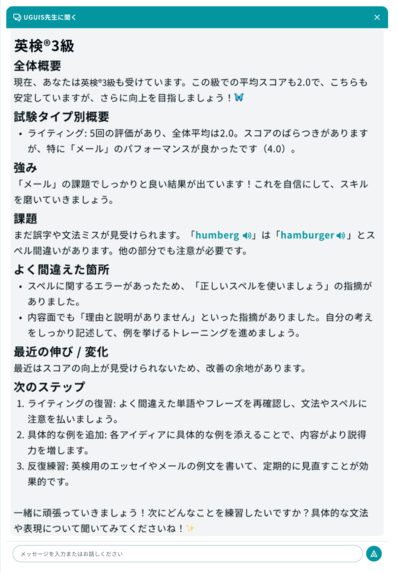 「ライティングの練習方法は?」「よく間違えるポイントは?」など、あらかじめ用意された質問をワンクリックで選べるほか、学習者が質問を入力するとUGUIS先生が回答してくれます。 さらに、「よく間違えた文法を具体的に教えて」「よく間違える単語を一覧で出して」など、より詳細なアドバイスもUGUIS先生から受けられます。 指導者はUGUIS先生と共に学習者のこれまでの取り組みを見守りながら、学習者自身が自律的に理解を深め、成長していくプロセスを支援できます。