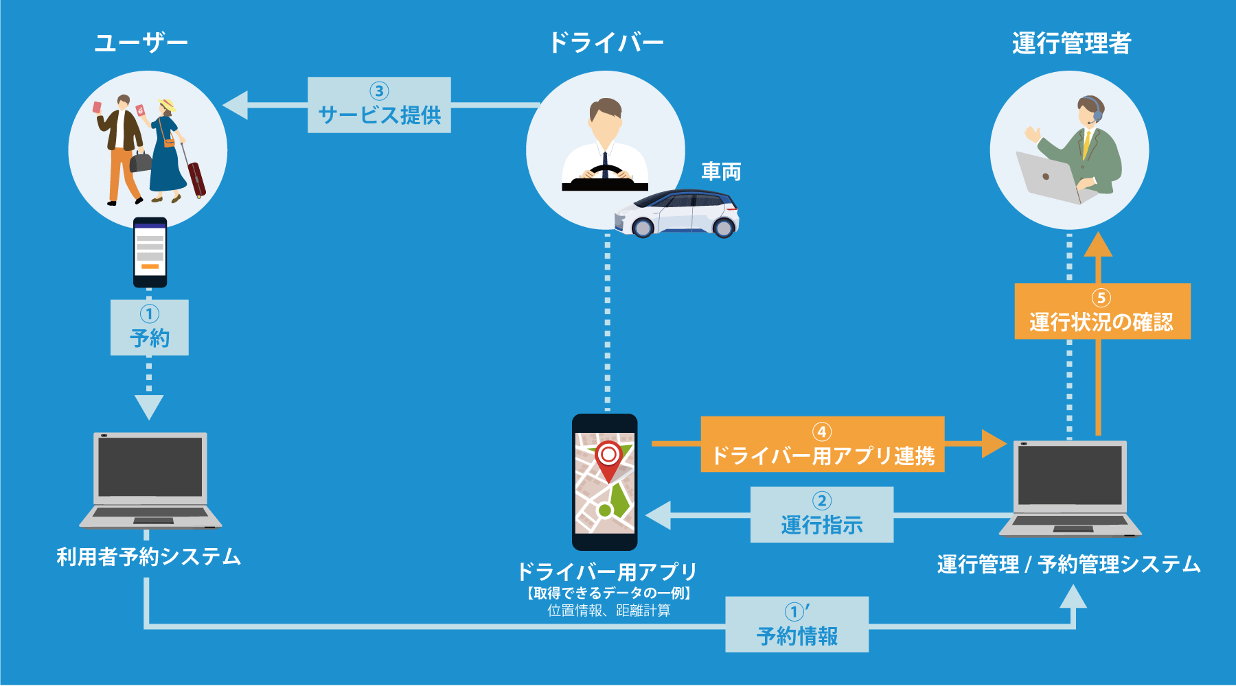 利用者向け予約システム、ドライバーアプリ、運行管理/予約管理を一体化したシステムを開発。利用者と配車側(ドライバー)のマッチングを最適化し、効率的で柔軟な移動サービスを実現します。
