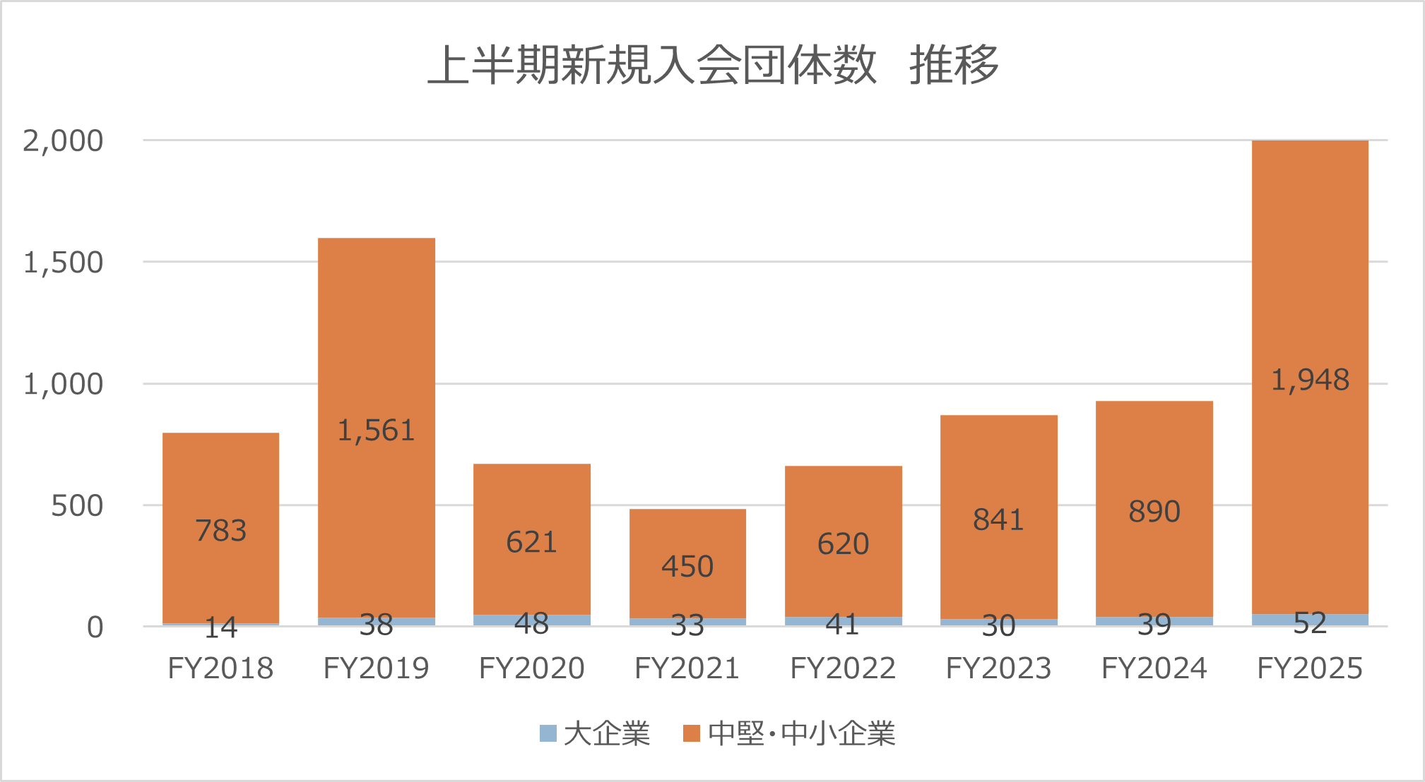 株式会社ベネフィット・ワン(代表取締役会長兼社長:松田 清人、以下「当社」)は、総合福利厚生サービスとして提供する「ベネフィット・ステーション」の2025年度上半期の新規入会団体数が過去最高である2,000件となったことをお知らせします。2024年度上半期実績の910件と比較して2倍以上の入会となりました。