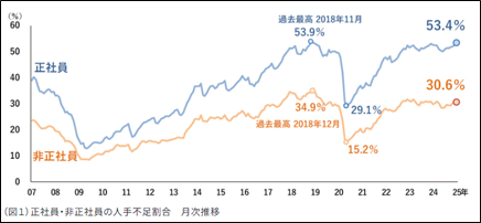 (出所)帝国データバンク「人手不足に対する企業の動向調査(2025年1月)」https://www.tdb.co.jp/report/economic/20250221-laborshortage202501/