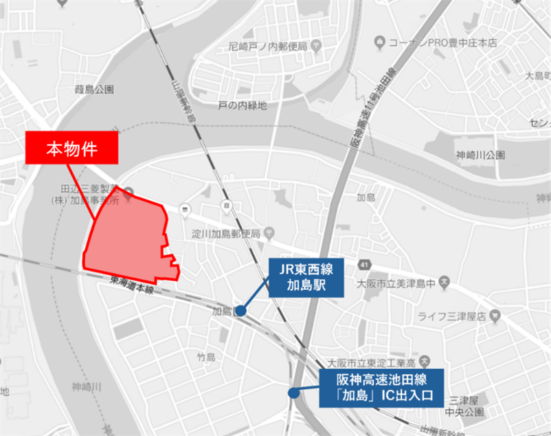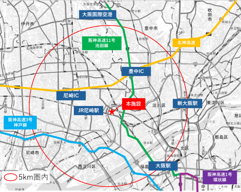 また、本施設が位置する淀川区は、人口・世帯数ともに大阪市内最大(※3)で、本施設の周辺5km圏内には約81万人が居住しており、物流施設の雇用確保やラストマイル配送にも有利な立地です。10km圏内には大阪梅田等の大阪中心エリアや、工場が集積する尼崎エリアがあり、また、阪神高速11号池田線「加島料金所」まで約2.2km、名神高速道路「尼崎IC」まで約4km、名神高速道路「豊中IC」まで約5.4km(※4)と関西全域への配送に非常に適しています。加えて、本施設はJR東西線「加島」駅から徒歩約4分と、従業員の通勤利便性に非常に優れています。