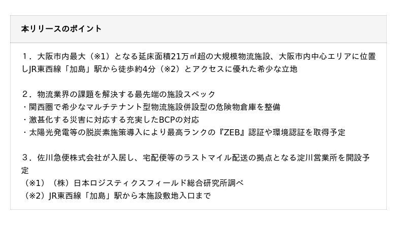 1.大阪市内最大の延床面積21万平方メートル 超の大規模物流施設、大阪市内中心エリアに位置し、JR東西線「加島」駅から徒歩約4分とアクセスに優れた好立地