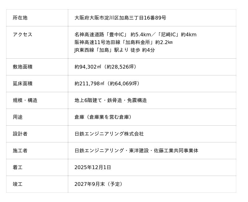 SGリアルティ株式会社(本社:京都府京都市、代表取締役社長:栗和田 武、以下「SGリアルティ」)および三井不動産株式会社(本社:東京都中央区、代表取締役社長:植田 俊、以下「三井不動産」)は、「SGリアルティ・MFLP大阪加島」(以下「本施設」)を12月1日に着工いたしましたことをお知らせします。