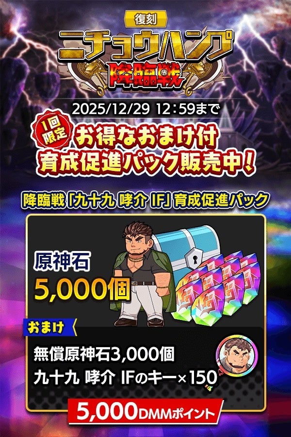 「復刻 ニチョウハンプ降臨戦」開催、「九十九 哮介 IF」の登場を記念して原神石に加え、育成素材が入手できてお得な「降臨戦「九十九 哮介 IF」育成促進パック」と、「復刻ニチョウハンプ降臨戦スペシャルパック」も3種登場!こちらも是非お見逃しなく!