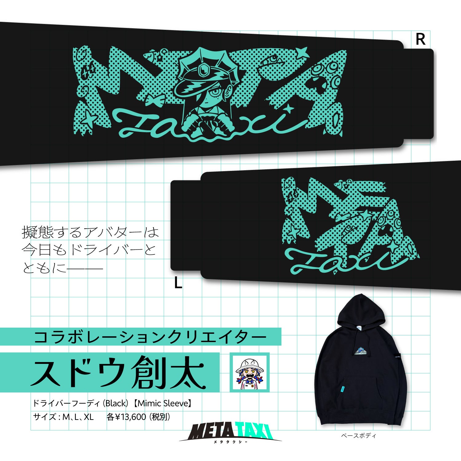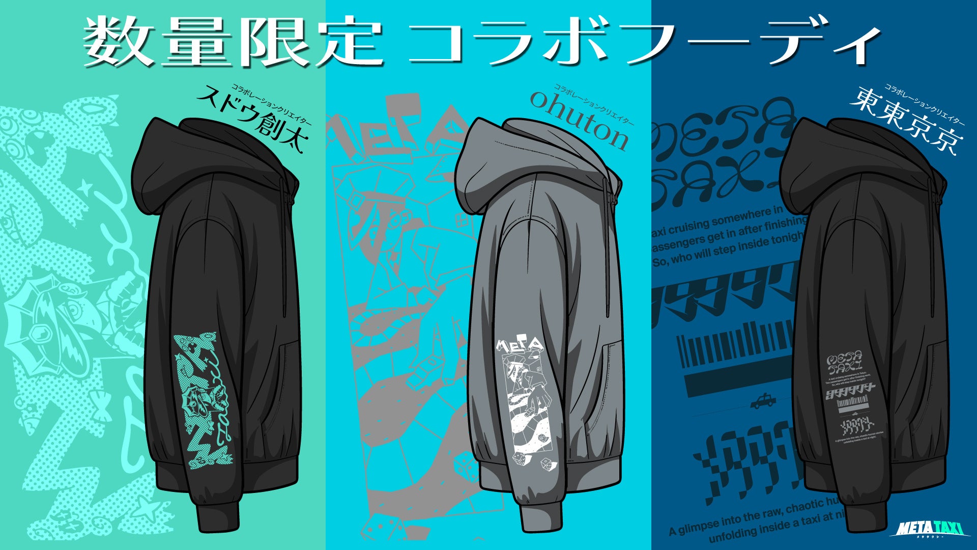 今回のPOP UP開催を記念して、スドウ創太・ohuton・東東京京の3組のクリエイターとのコラボレーションフーディが数量限定で販売。各クリエイターがMETA TAXIをモチーフに描きおろした遊び心あるデザインの特別仕様となっています。数に限りがあるため、お早めにお求めください。
