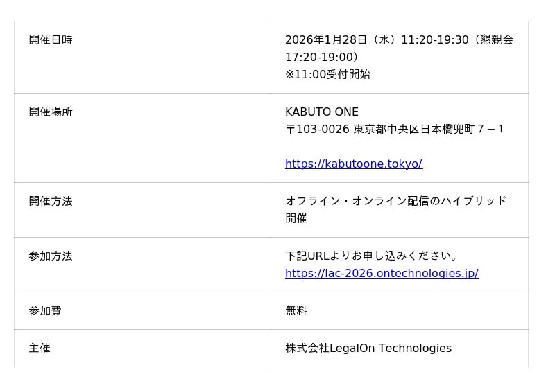 株式会社LegalOn Technologies(本社:東京都渋谷区 代表取締役 執行役員・CEO:角田望、以下LegalOn Technologies)は、2026年1月28日(水)11:20より、日本最大級*の法務カンファレンス「Legal AI Conference 2026」を日本橋「KABUTO ONE」にて開催いたします。