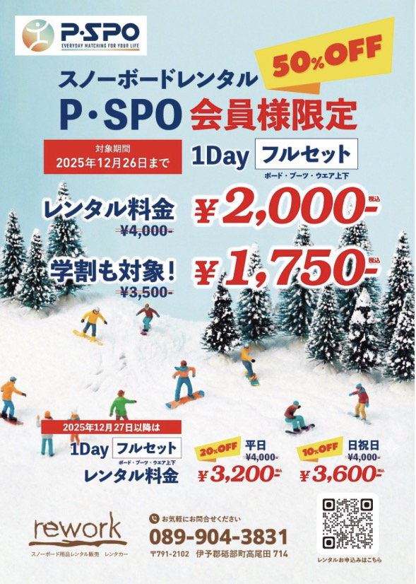 愛媛県伊予市のスノーボード専門レンタル店「rework」は、P・SPO会員向けに、スノーボード1DayフルセットをMAX50%OFFで提供する冬季限定キャンペーンを実施しています。