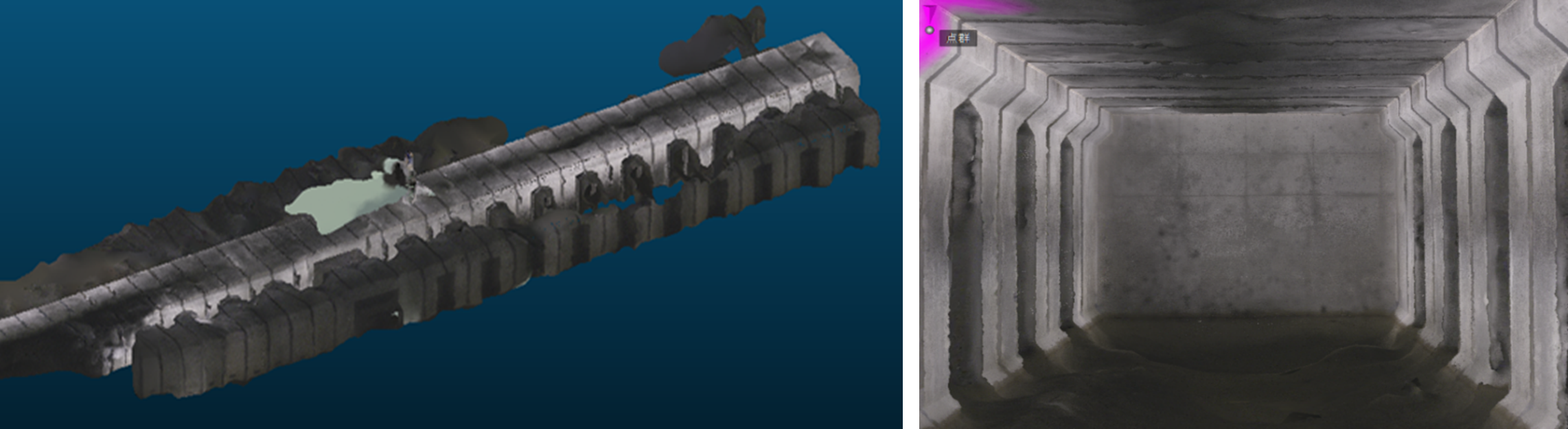 「IBIS2」で撮影した動画データをもとに点群データを生成し、管路内部の3Dモデルを構築しました。さらに、3次元データ計測システム「SEAMS」により地上部の周囲環境を取得し、その情報をもとに地上・地下を一体化した3次元データの作成に成功しました。