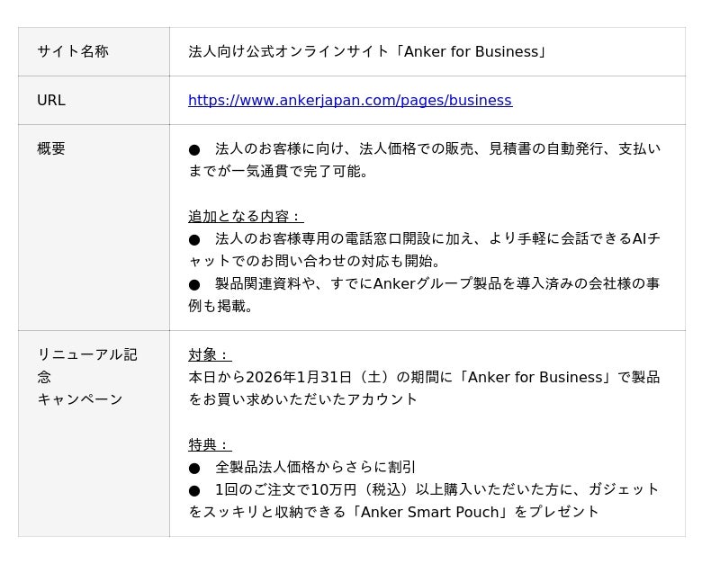 【アンカー・ジャパン】法人向け公式オンラインストア「Anker for Business」をリニューアル!リニューアルを記念して期間限定キャンペーンを実施
