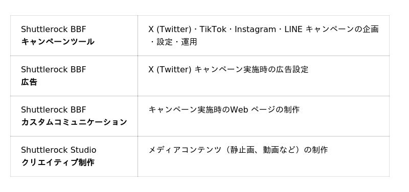 Instagram などの各種SNSを活用したキャンペーンの支援サービス(キャンペーンツール Shuttlerock BBFの開発と運用、キャンペーン事務局代行など)、