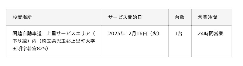 当行は、株式会社ネクスコ東日本エリアトラクト(本社:東京都港区、代表取締役社長:吉見 秀夫、以下「ネクスコ東日本エリアトラクト」)が運営する関越自動車道の上里サービスエリア(下り線)内(埼玉県児玉郡)に、ローソン銀行ATM新型機を2025年12月16日(火)に1台設置いたしました。当行がローソン店舗以外でサービスエリア内にATMを設置するのは今回がはじめてです。