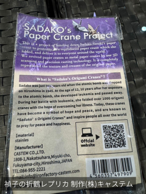 今回贈呈したピンバッジは、佐々木禎子さんが実際に折った極小の折り鶴を、最新のデジタル技術と鋳造技術(株式会社キャステム)を用いて忠実に再現したものです。このプロジェクトは、NPO法人SADAKO LEGACY(サダコ・レガシー)の協力のもと推進されており、世界中に平和の尊さを発信し続けています。