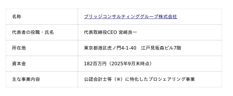 ブリッジコンサルティンググループ株式会社(本社:東京都港区、代表取締役CEO:宮崎良一、東証グロース:証券コード9225、以下「当社」)は当社が運営する公認会計士に特化したプロフェッショナル人材データベース「会計士.job」の登録会員数が6,000名を突破したことをお知らせいたします。