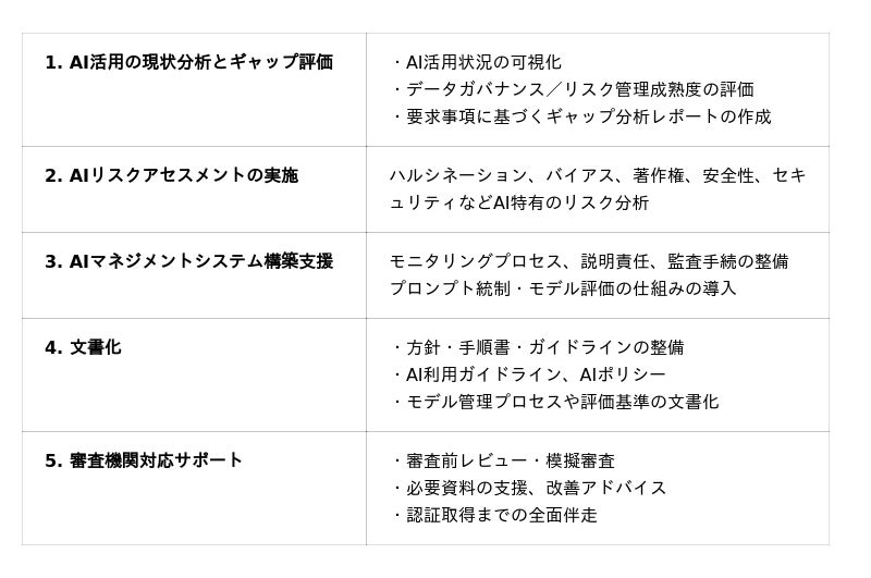 ISO 42001の規格概要や実務における対応ポイントを解説しており、本サービスとあわせてご覧いただくことで、AIマネジメントシステムへの理解をより深めていただけます。