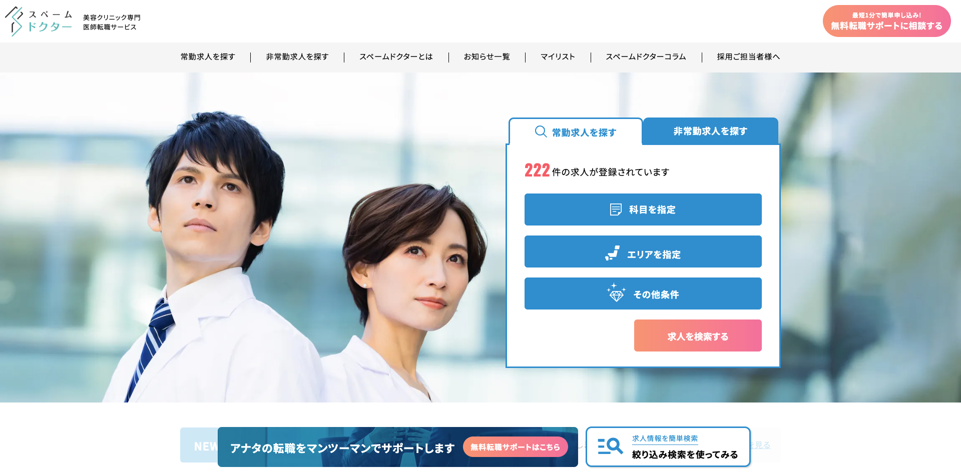 本サービスは、医師の美容クリニックへの転職をサポートする「スペームドクター」と、看護師の美容クリニックへの転職をサポートする「スペーム看護師」の2つのサービスとなります。