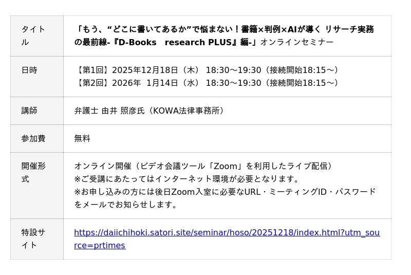【無料セミナー】「もう、“どこに書いてあるか”で悩まない!書籍×判例×AIが導く リサーチ実務の最前線-『D-Books research PLUS』編-」開催決定!