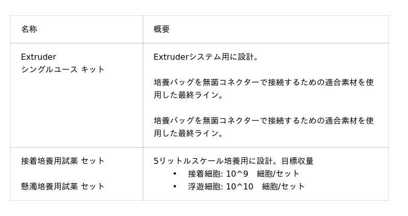 CellFiber Extruderは、GMP細胞製造におけるファイバ培養用に設計されており、バイオリアクター用細胞培養バッグと無菌接合し、細胞を封入したファイバを直接培養バッグに無菌的かつ閉鎖的に吐出し、培養することができます。専用のシングルユースキットと試薬キットを使用することで、CellFiber Extruderシステムは細胞製造において以下のような重要な利点を実現します。