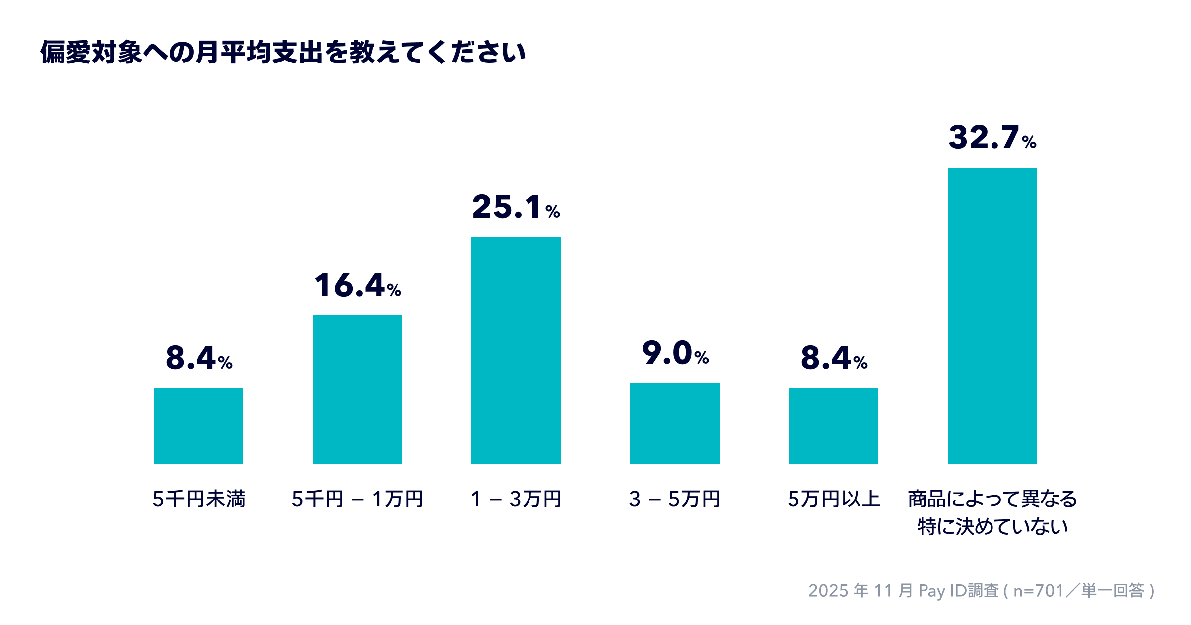 偏愛消費の月平均支出については、毎月一定金額を支出している方が67.3%で、うち「1~3万円」が25.1%と最多となりました。