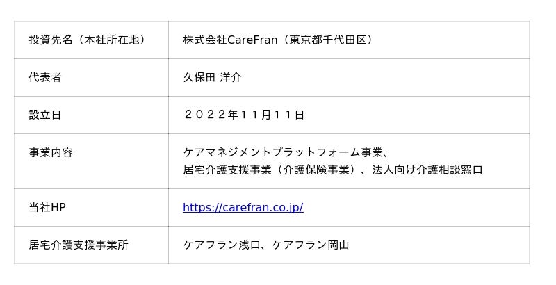 介護現場の業務効率化と柔軟な働き方の実現を目指す「株式会社CareFran」へ出資しました