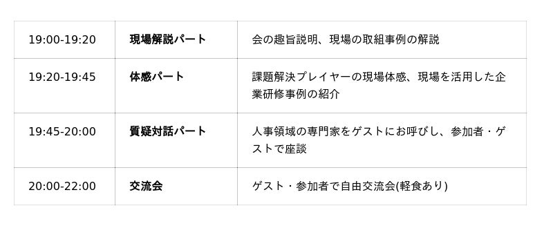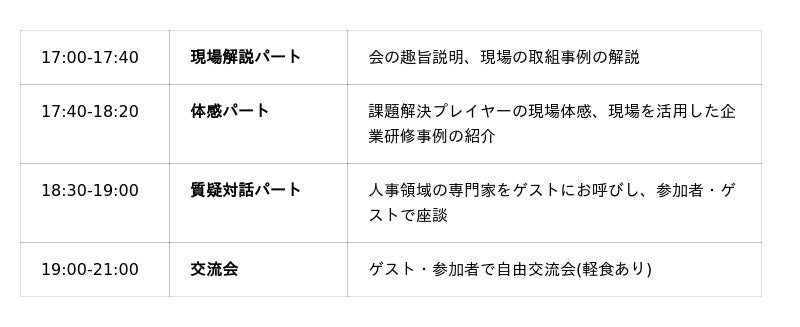 - 越境学習の効果を自分で体感してみたい- 人事領域に詳しいプレイヤーにいろいろ質問してみたい- 研修・育成プログラムに社会課題の視点を取り入れたい- 社会課題起点の新規事業創出を強化したい- 「ダイバーシティ」「DE&I」「障害者雇用」などの領域に関心・課題感がある