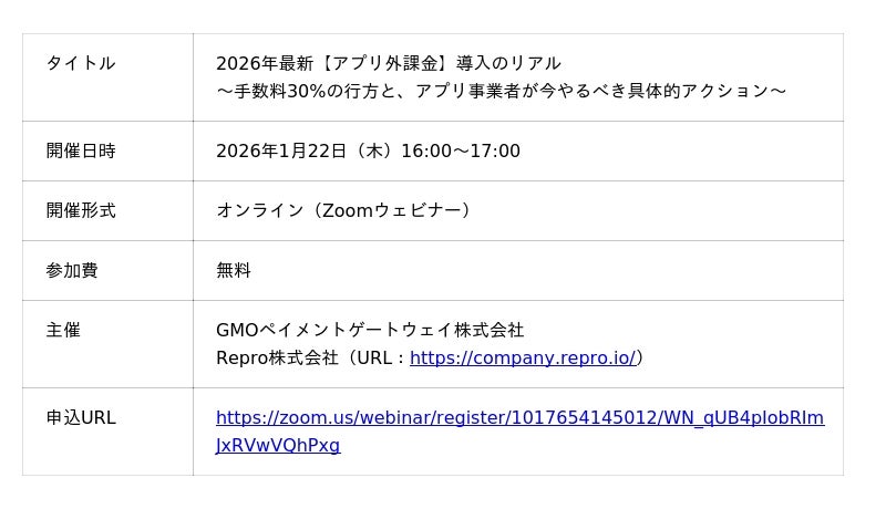 GMOインターネットグループのGMOペイメントゲートウェイ株式会社(代表取締役社長:相浦 一成 以下、GMO-PG)は、2026年1月22日(木)16:00より、スマホ新法(スマホ法)(※1)の全面施行を受けて変化するアプリ外課金の最新動向を解説する無料オンラインセミナーを開催します。